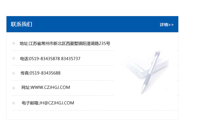 地址:常州市新北區友邦商務大廈1幢16、17層  電話:0519-85101652  傳真:0519-85112595  郵編:213022  網址:www_cz-jiayue_cn.chinaclxs.com  郵箱:xiajifengaa@163.com